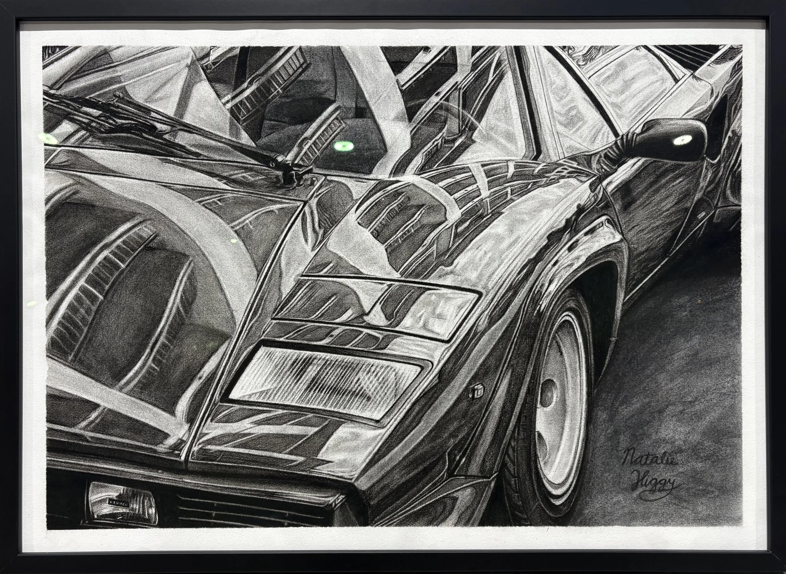 Lamborghini Countach, 30in x 22in, framed charcoal drawing, 2025